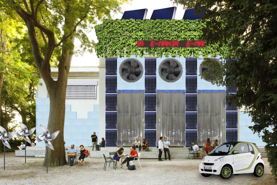 Verfremdeter Pavillon: Vollwäremeschutz, Windrad, Solarpanels, Lüftungen, Streifenvorhänge, LED Display, Elektromobil, Kollektoren und Fassadenbegrünung