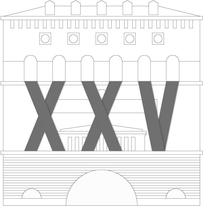 Der silberne, metallisch glänzende Stoff, der sich in feierlich dekorativen Bahnen über die Fassade spannt, kontrastiert die ursprüngliche Intension der nüchtern reduzierten Architektur und greift das Prinzip der Symbolik auf. Kodiert repräsentieren die grafischen Zeichen XXV das 25-jährige Jubiläum. Auch die silberne Optik des Materials steht gemeinhin symbolisch für die Zahl 25 und sorgt weit sichtbar für aufmerksamkeitsstarke Lichteffekte.