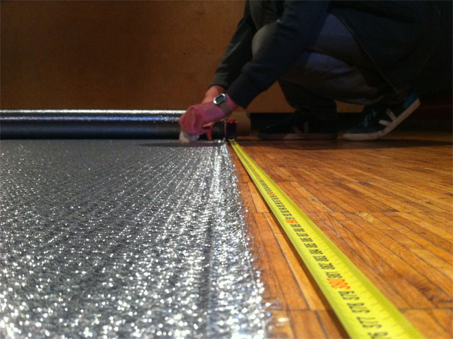 Bei dem verwendeten Material handelt es sich um schwer entflammbares Effektgewebe aus der Theater- und Bühnentechnik. Der Stoff besteht aus 100% Polyester bei einem Gewicht von 95 g/m2. Die Rollen wurden in einer Laufbreite von 310 cm angeliefert und zugeschnitten. Insgesamt wurden 25 m Konstruktionsholz, 60 Laufmeter Stoff und über 100 Schrauben verbaut.