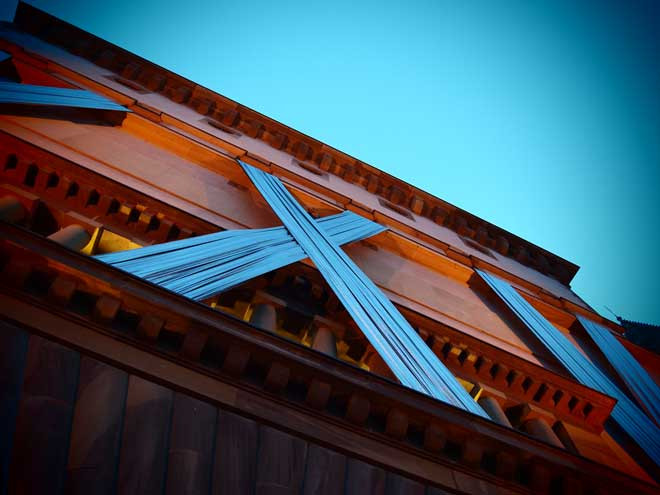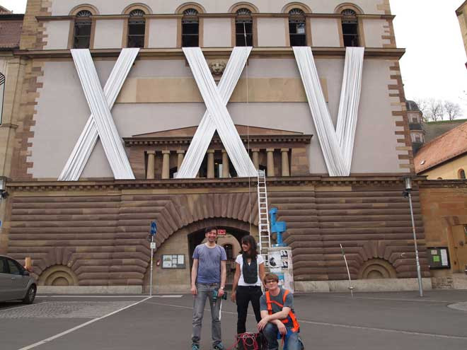 Eine große Herausforderung war die Entwicklung einer reversiblen Befestigung der Installation an der denkmalgeschützten Fassade des Gebäudes. Es wurde ohne Bohrungen oder anderweitige Eingriffe in die Bausubstanz gearbeitet. Auf Grund der Dimensionierungen der Installation – 20x8m auf einer Montagehöhe von 6-16m – musste die Montage in mehreren Teilschritten erfolgen und im Voraus genau geplant werden.