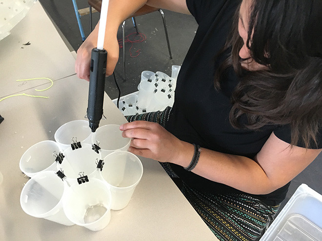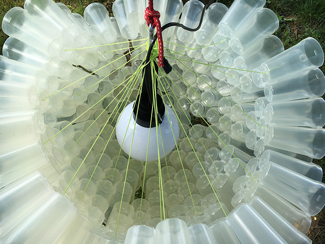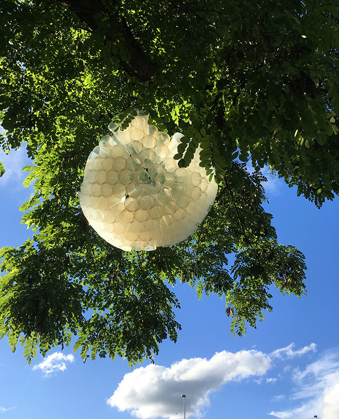 Aus ca. 500 ausrangierten Pfandbechern entstand eine Lichtinstallation in Form von 3 Halbkugeln. Die Becher wurden mit Heißkleber und Nieten in kleinen Einheiten verbunden und dann mit Maurerschnur zu Kugeln gehängt. Im Zentrum befindet sich jeweils eine Kugellampe. Die Radien der Halbkugeln leiten sich aus der konischen Grundform der Becher ab. Durch die Hängung entsteht eine stabile aber flexible Konstruktion, die alle Becher zu einem lockeren Bündel zusammenfasst. Durch die Verbindung und Wiederholung der kleinteiligen Formen entstehen wabenartige Strukturen und ein organischer Gesamteindruck. Die etwa 1 m großen Objekte wurden hängend im Baum installiert. Sie wirken wie große Blüten oder Früchte. So entsteht ein interessantes Zusammenspiel von Plastikmüll und Natur.