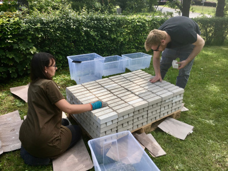 Die Barren werden für die Ausstellung auf einer Europalette aufgestapelt präsentiert und im Freien dem Verfall durch Witterung bewußt ausgesetzt.